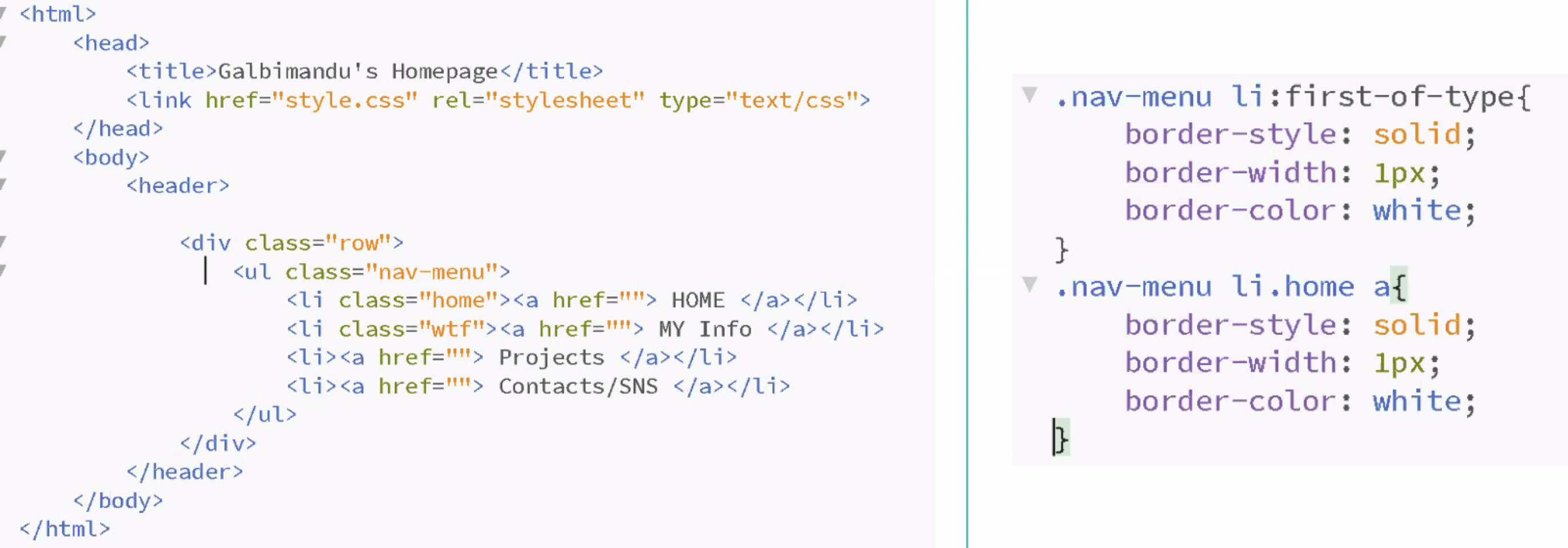 팀원의 문제는 .nav-menu li .home a {}가 실행이 안된다는 것이다.